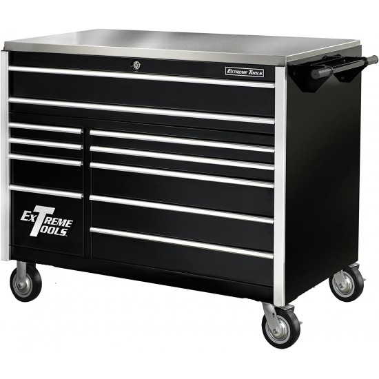 We have taken great care in designing the features you really want. The 55 In. 11 Drawer Professional Roller Cabinet includes exclusively patented features which cannot be found anywhere else and give you the most for your hard-earned money. Whether you have screwdrivers and ratchets or a 48 In. pry bar, there is a place for everything. Our double steel wall drawer front design gives greater strength to each drawer and hides interior dents from tools. Drawer back panel is designed for rigidity to allow the drawer to hold more weight without sagging or flexing. You will see no spot welds on our drawer fronts, hutch or side cabinets. The 30 In. deep roller cabinet has a self-adjusting spring lever action for increased security and smoother drawer action. Exclusive modular drawer design allows the drawer configuration to be rotated and arranged to suit your needs. Top sub-weldment keeps the top of the box rigid and stable. Roller cabinets come standard with an upgraded stainless steel top work surface. Four 6 In. x 2 In. casters (2 locking swivels and 2 rigid) load rated 950 lbs. each. 2 Extra long drawers and 2 extra deep drawers to accommodate hard-to-fit tools. Shipping Weight: 1,000 Lbs.