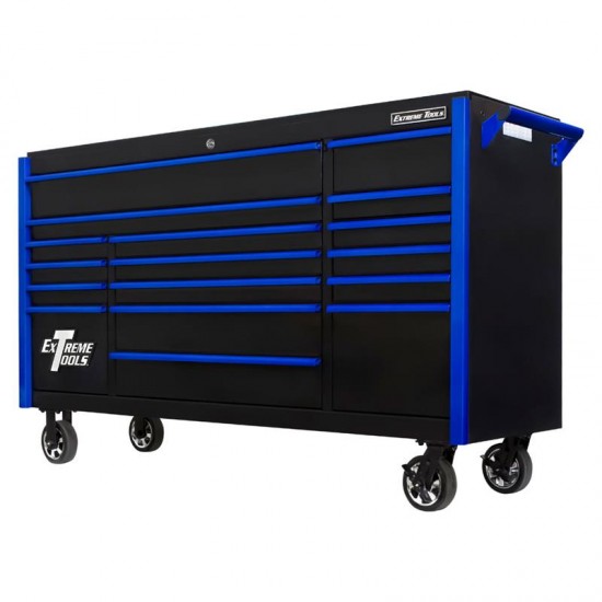 Extreme Tools DX Series 72-in 17 Drawer Deep Roller Cabinet with Black with Blue Drawer Pulls